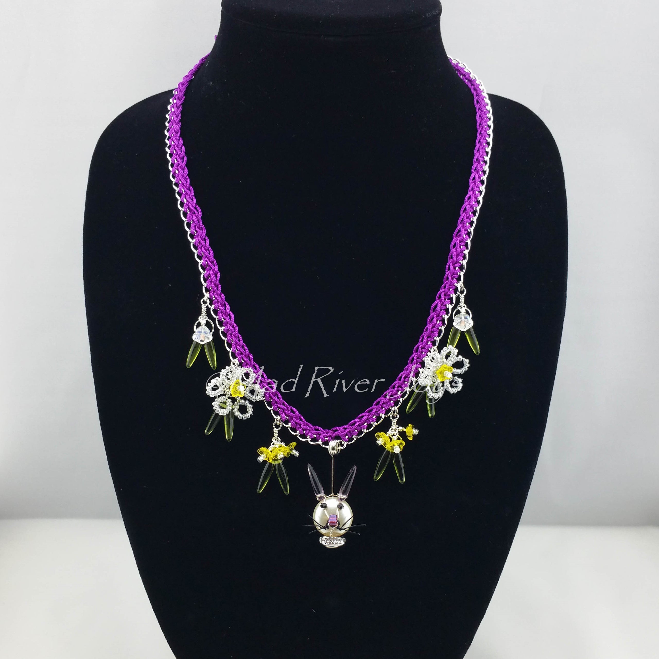 This year's Easter Bunny is fashioned from a Swarovski glass pearl, Czech glass ears, wire, and other glass and metal beads. The daffodils are made with Czech glass beads and various glass seed beads on wire. Bunny and daffodils hang from a 22" silver-plated chain finished with soft magenta cording, a large oval lobster clasp, and a 3" chain extension.